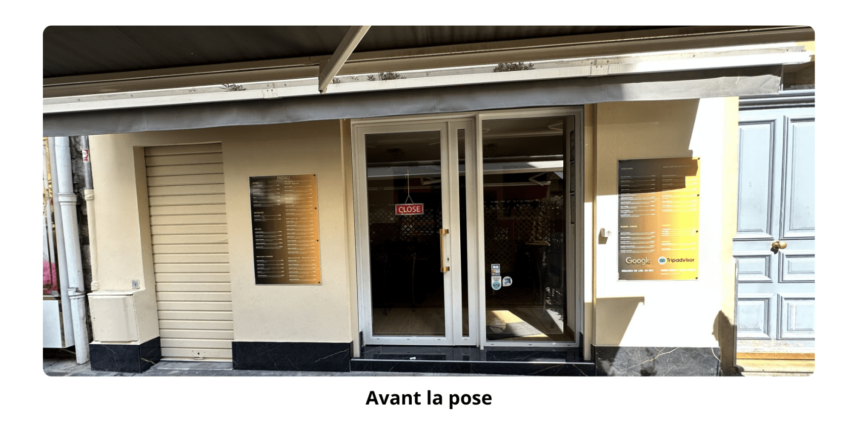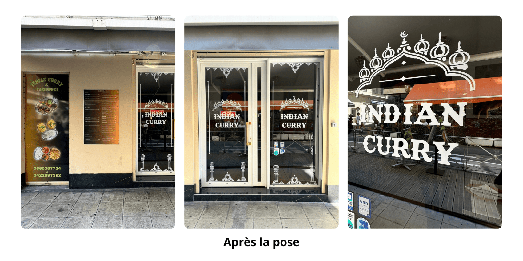 Avant la pose, le client disposait d’une façade sans visibilité particulière, avec un volet métallique toujours baissé et des portes vitrées très simples. Après analyse de leur positionnement et de leurs besoins, nous avons proposé une signalétique combinant adhésifs décoratifs sur les vitrines et un panneau illustratif sur le volet, capable de valoriser leur identité indienne et d’attirer l’œil des passants. Cette approche permet de projeter le résultat final avant même la pose, pour un rendu esthétique et fonctionnel parfaitement adapté à leur façade niçoise.